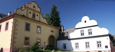 Je zdoben raně barokním štítem s erby Koců z Dobrše a Karlů ze Svárova z roku 1684.